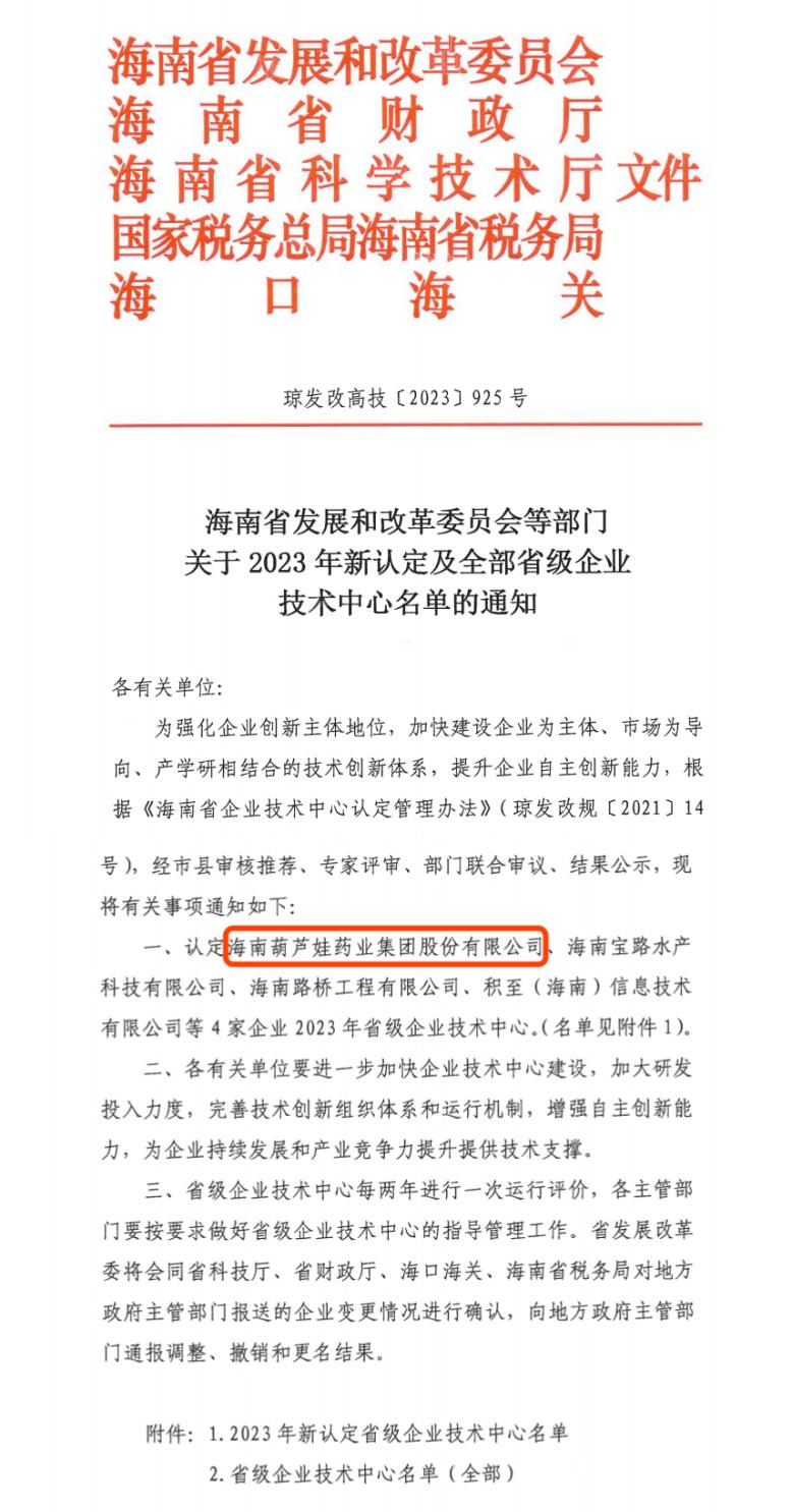 近日,海南省发改委等多部门联合公布了《关于2023年新认定及全部省级企业技术中心名单的通知》,其中,海南公海彩船药业集团股份有限公司成功通过评审,被认定为省级企业技术中心,是本次获批的4家企业之一。